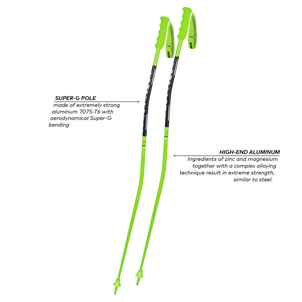 The Nationalteam SuperG Pole is suitable for every advanced skier who would like to benefit from the Komperdell Worldcup design without purchasing the original Worldcup equipment. The exceptionally strong tube made of durable, high-resistant, and rigid aluminium 7075-T6 guarantees maximum holding power, stability, and ideal turn performance. Its aerodynamic shape perfectly adapts to the body. The powder strap is easy to open and close while maintaining maximum hold. The rubber race grip provides optimal hold and a comfortable grip feeling. With its distinctive green-black design, it stands out on the ski slopes.