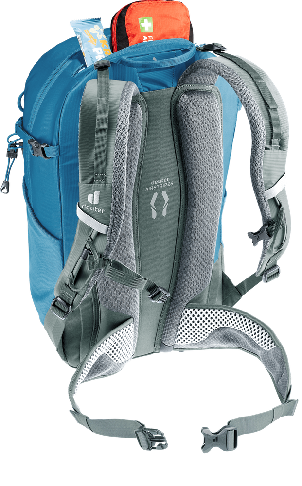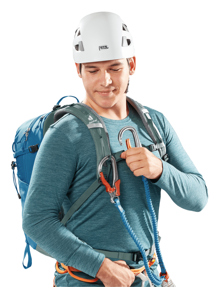 The reduced contact surface and large ventilation channels of the deuter Airstripes back system combined with perforated shoulder straps and hip fins ensure maximum airflow and even weight distribution – for a snug, secure fit over any terrain. Loops on the shoulder straps keep via ferrata set carabiners close at hand. And thanks to a large front zipper opening, front stash pocket, and side pockets, equipment and gear are always easy to access.