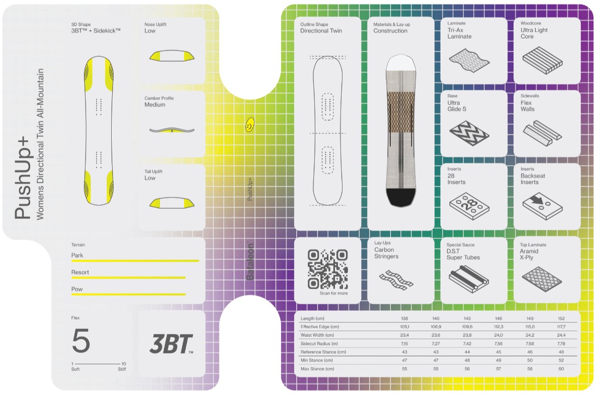 Featuring a mid flex combined with a powerful, catch-free shape and camber profile, the Push Up Plus has become one of the most versatile women's boards in the Bataleon range. From park obstacles to jump lines, to laying down some carves to even diving into some pow pockets. The Push Up Plus has made a great board even better.