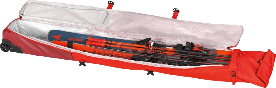 As the name suggests, the Atomic RS Double Ski Wheelie case is large enough to comfortably carry two pairs of skis plus poles and accessories. Now available in minimalist black and Rester red. It's stylish, stain-resistant on the outside and easy to clean thanks to a tarp lining. It has multiple pockets and straps to keep your skis secure, and a special roll-top length adjustment allows you to pack your skis tightly and securely. On the outside of the case, there are three padded compression straps, double handles and quiet large wheels that make it easy to carry or transport the case, even when it is fully packed and very heavy.