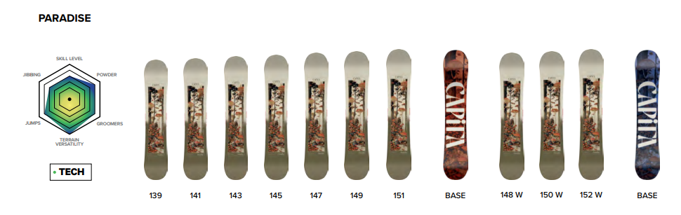 Lightweight and versatile, this is the ideal board for an intermediate rider with all-terrain skills. Paradise boards are perfectly balanced for riding in different terrains. They are very stable, yet forgiving and easy to handle. Featuring camber underfoot for increased control and a raised nose and tail for floating in powder. Paradise handles the bumps that mountain life may throw your way with ease.
