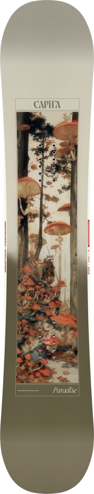 LAMINATE: PLT™ – The PLT™ technology is exclusive to CAPiTA MFG and magically bonds the topsheet to the board already pressed in the mold. This is unique in the snowboard industry, as the rest of the world applies topsheets using glue, heat, and pressure during the pressing stage. This causes the fiberglass structure underneath to show through the topsheet. And since no one wants to spend their hard-earned money on an uneven snowboard, many companies cover their boards with a thick, toxic lacquer to even out the surface. Not only is this HEAVY and can lead to unsightly cracks, but it’s also very unhealthy for the work environment. The PLT™ machine produces feather-light, smooth, glossy finishes without all that toxic burden, resulting in a beautifully layered laminate structure. The combination of matte, glossy elements and golden lettering makes an amazing impression. Besides the final ink pressing into the board, CAPiTA uses both digital printing and classic screen printing in the production process, which provides multilayered graphics.