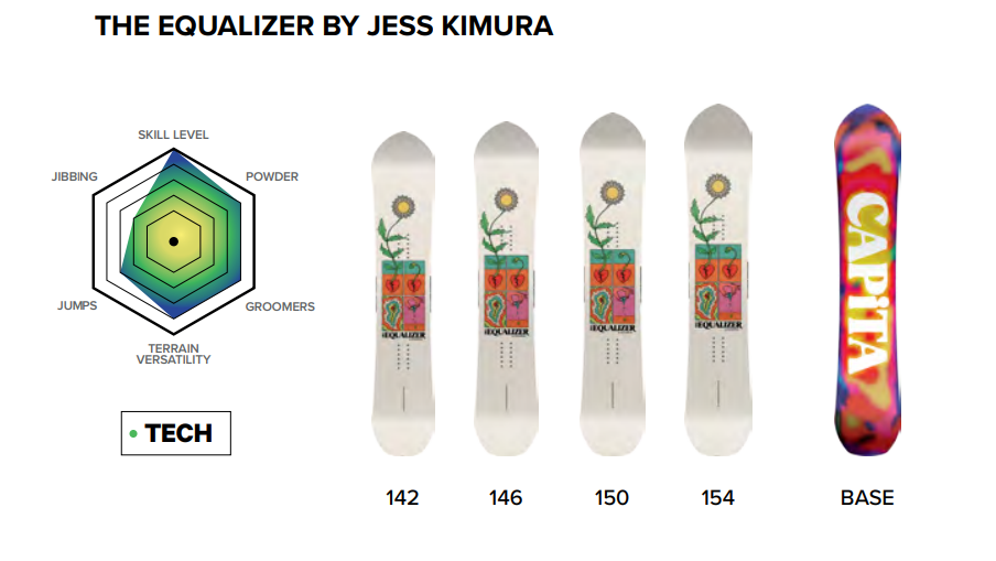 Riding the Equalizer delivers exceptional feel and response thanks to the META CORE™, which offers the ideal flex for all-mountain terrain, while TECHNORA™ + FLAX BOOSTERS provide longitudinal stiffness. This board also features the ultra-fast sintered QUANTUM DRIVE™ base, making the Equalizer one of the most technically advanced women's freeride boards on the market. In the Capita lineup, this board is the women's counterpart to the CAPiTA Mercury.
