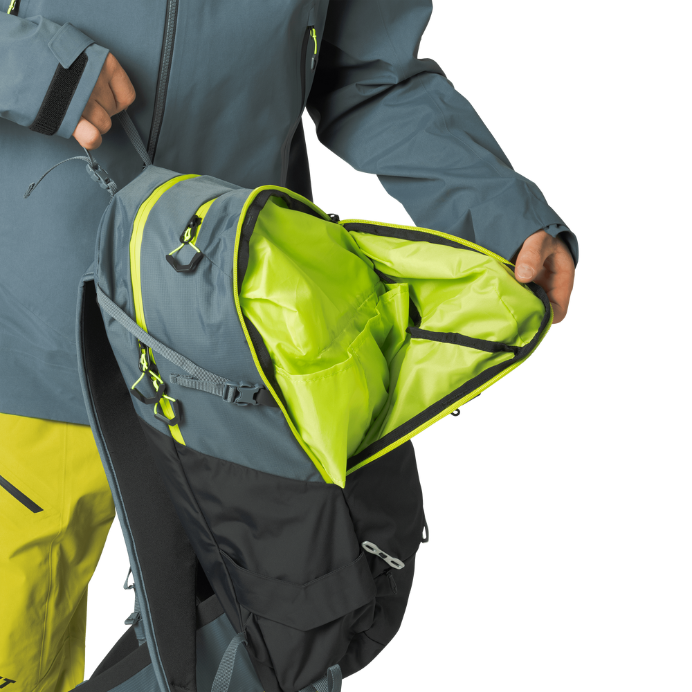 Lots of storage space, a clever layout: The separate crampon compartment protects your equipment and allows quick access. Additional compartments for safety equipment and attachments for skis, helmets and ice axes keep things tidy. The well-ventilated carrying system offers a high level of comfort, while the robust Cordura® material made of recycled nylon easily withstands contact with rocks.