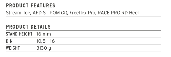 The Freeflex ST 16 X RD is one of the top models in our racing collection. The bindings are distinguished by Adaptive Suspension Technology - a solution that includes an independent spring-loaded construction of the rollers, two mounting positions of the skid plate offering an adjustable pressure point, a steel base between the plate and the binding for even more efficient power transfer and a 5mm lower contact point between the rollers and the ski boot, which ensures the natural bend of the ski. Like all models in the X range, the Freeflex ST 16 X RD bindings feature a race-optimized release system and axial force adjustment for ultimate fit precision and maximum performance. To meet the challenges of competitive skiing, some elements of the bindings are made of aluminum. This ensures maximum stability, durability and efficient energy transfer.