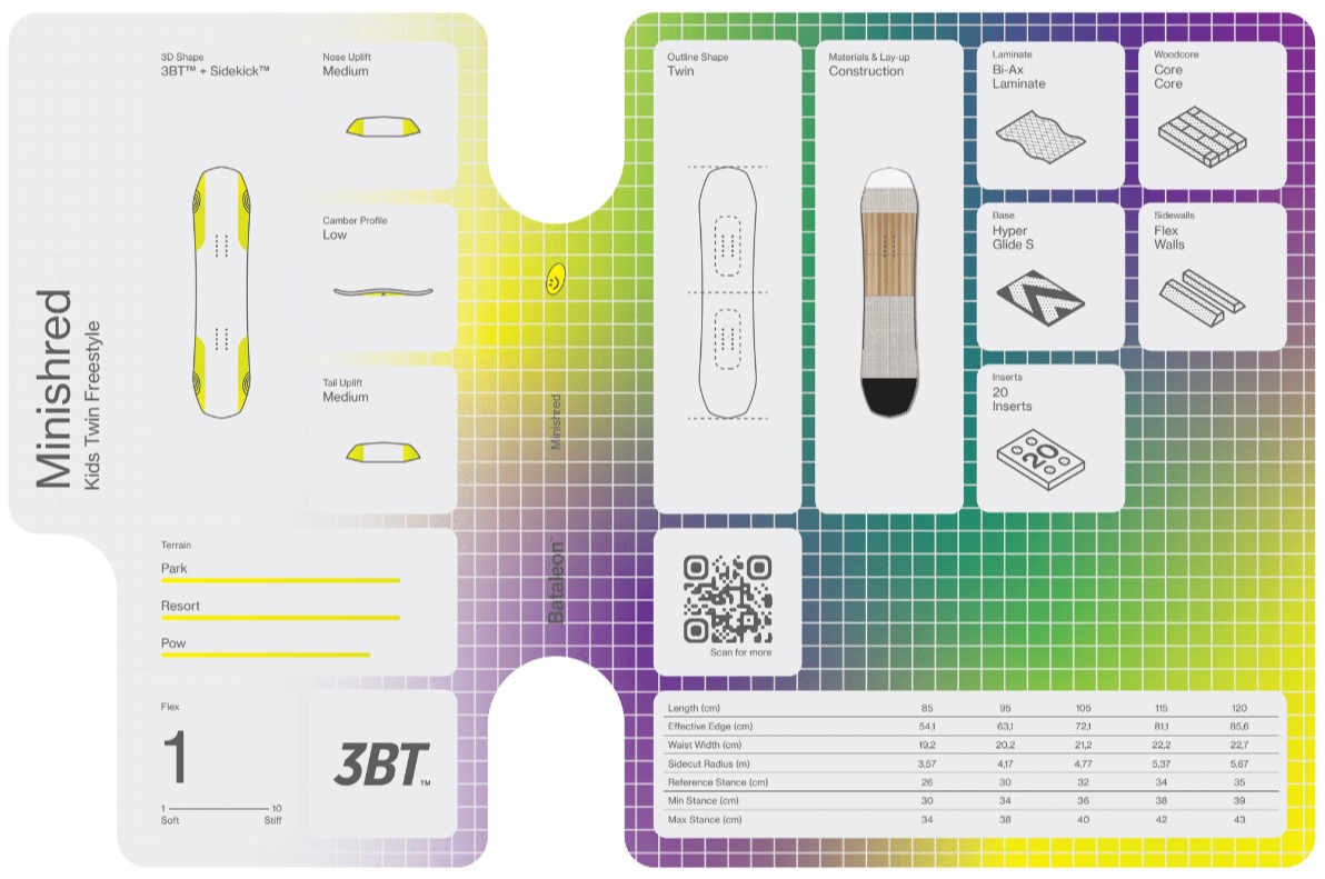 The naturally forgiving characteristics of 3BT make the Minishred an ideal board for children. The lifted contact points and tip to tail camber allow your kids to focus on linking turns without having to worry about catching their edges. It’s built to the same high standard as all our boards with a full wood core, sintered base, 3D profile and SideKick. Don’t let your kids ride flat!
