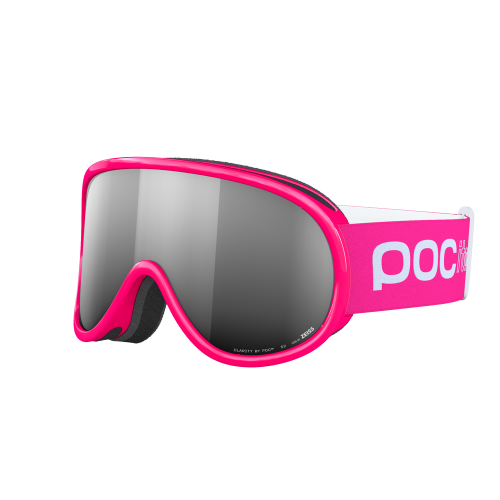 • POCito Retina kids’ ski goggles with Clarity lens, mirrored finish, UV400 protection, anti-fog coating, and silicone strap for helmet stability.