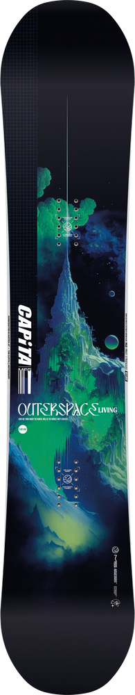 The Capita Outerspace Living is a versatile snowboard, combining a freestyle twin-tip shape with a hybrid camber ideal for freeride. The inserts are slightly set back, but there is also the option for a centered binding setup, making the Outerspace Living suitable for everyone—from beginners, rail enthusiasts, and speed lovers on groomers to freeriders in deep powder.