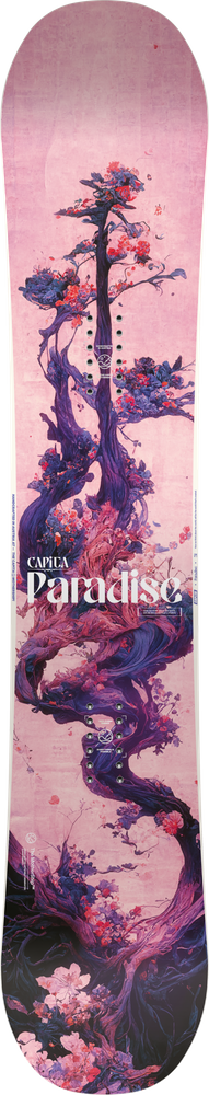 Capita Paradise is a lightweight and versatile snowboard, perfect for intermediate riders who enjoy all-terrain adventures. Thanks to its excellent balance, Paradise offers stability while remaining forgiving and easy to handle. The camber underfoot increases control, while the raised nose and tail enhance flotation in powder. This board handles the bumps and challenges of mountain terrain with ease.