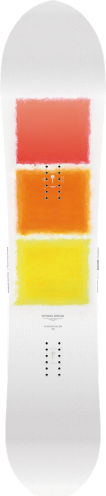 Spring Break Powder Racers is a snowboard that leverages one of the most popular shapes from the Ultralight Powder Displacement Snowcraft collection, offering it at a more affordable price. The large surface area ensures excellent floatation, while the deep sidecut allows for precise carving on the slopes.