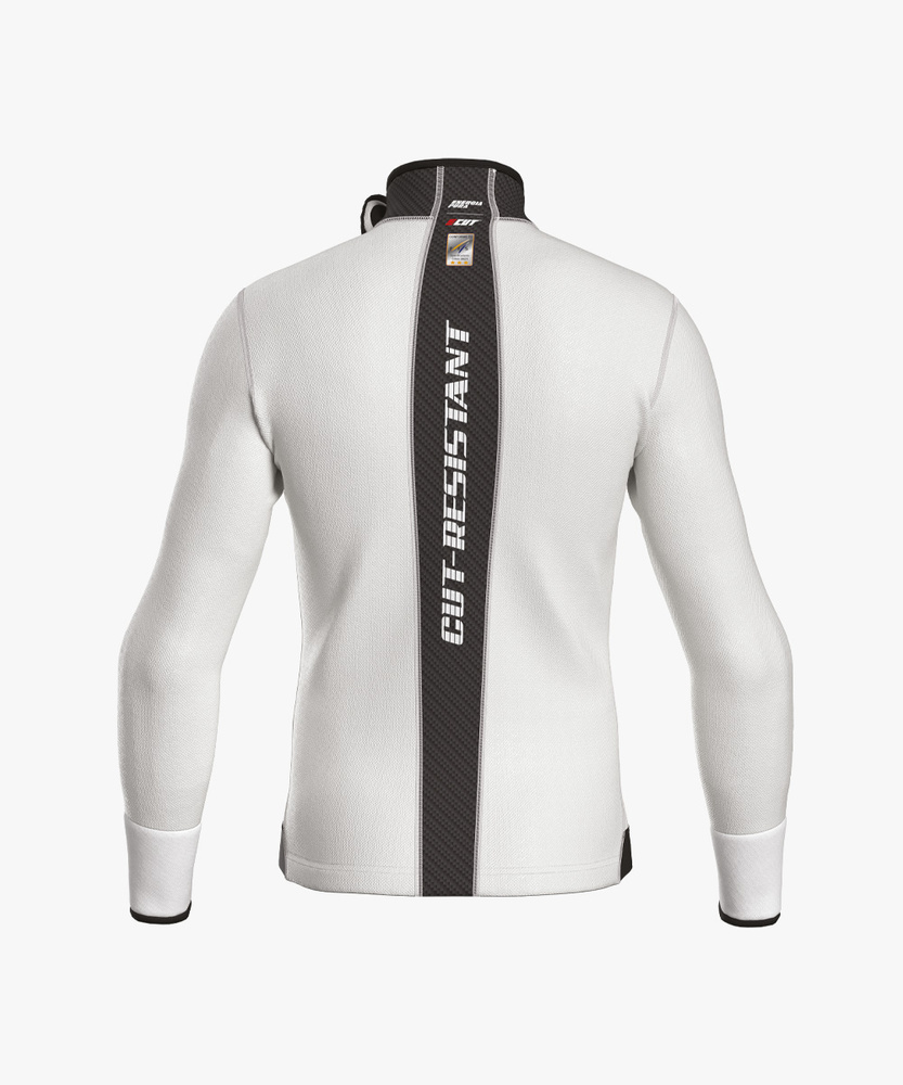 • Energiapura Cut Resistant Pro SR Full Zip ski shirt. Certified 3-star FIS, Level 4 cut protection (EN 388:2016). Ergonomic fit, high-performance safety gear for ski athletes.