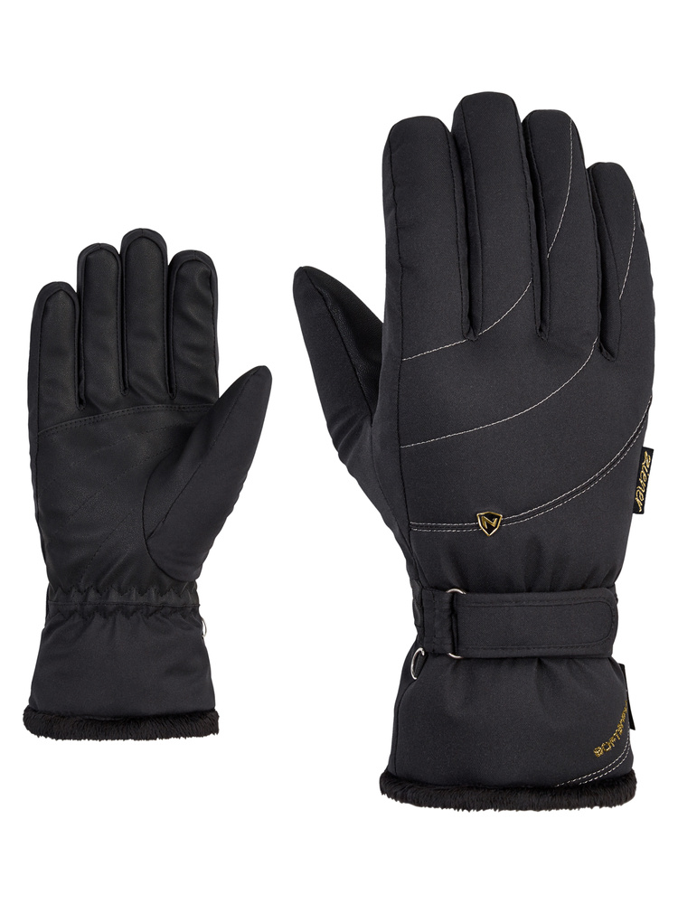 The warm and very soft ZIENER women’s ski gloves KAHLI-Z PR LADY impress with their cozy plush lining and the new PrimaLoft® CROSS CORE™ technology. This revolutionary insulation technology provides exceptional thermal performance while remaining extremely lightweight. The water- and wind-repellent properties keep the gloves comfortably warm even in cold temperatures. With the adjustable strap closure, the gloves can be perfectly fitted to the wrist. Elegant details and the visible plush cuff make these gloves a stylish companion both on and off the slopes.